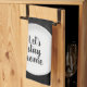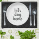 Vit middagsplatta med silvergods på svart läderdesign och "låt oss håll dig hemma". Text kan redigeras.