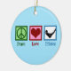Peace Kärlek Pilates. En söt pilatinlärargåva med fredstecken, hjärta och kvinna som sträcker sig över en träning boll.
