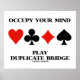 Dubblettspelare kommer att kunna använda den här poster med det fyra kortets kostym tillsammans med orden "Occupy Your Mind Play Duplicate Bridge Bridge". Underbar dubbelbron humor poster gåva till varje dubbelbrons klubb!