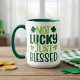 Det här söta mugg har en roligt som säger "Inte Lucky Just Blsed" i olika skuggor av grönt med klöver-skuggor. Perfekt för St patrick's day!