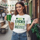 Den här t-shirt-roligten har en söt grafik som säger "Inte Lucky Just Blsed" i varierande skuggor av grönt med schamprockaccenter i klöver. Perfekt för St patrick's day!