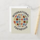 Fira internationell vänskap med en färgstark jordglob med ord inlindat runt cirkeln. Underbar för postutväxling mellan land eller internationell business hälsning. Symbol för förståelse mellan världens alla folk.