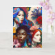 Stor inspirerande gratulationskort för personlig användning eller för företag för att främja jämställdhet mellan könen. En mångfaldig abstrakt collage av kvinnor och texten "IWD" och "Internationella kvinnodagen". 8 mars är internationella kvinnodagen. Kortsidans insida har en kort historik om internationella kvinnodagen.