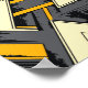 The design features a bold mix of yellow, gray, black, and cream tones. It consists of large triangles that overlap and intersect in a precise geometric pattern. Inside each large triangle, there is a smaller triangular form, enhancing the sense of depth and layering. Yellow lines and dark textured areas highlight the composition, creating strong contrast and symmetry. The overall appearance is modern, abstract, and visually dynamic.