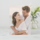Denna bröllopsinbjudan visar en öm ögonblick mellan ett par som kramas, båda klädda i vitt, vilket skapar en harmonisk och lugn färgpalett av vitt och ljust beige. Den mjuka, suddiga bakgrunden antyder en idyllisk strandmiljö med antydningar om vågor och himmel, vilket förstärker den naturalistiska stilen som betonar värme och intimitet. Den fotografiska representationen fångar en spontan, glädjefylld interaktion som förmedlar en stämning av lycka och lugn. Perfekt för par som söker en elegant och hjärtlig design för att fira sin speciella dag.