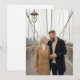 This wedding invitation features a romantic photograph of a couple standing on a bridge, holding hands and smiling at each other. The design showcases a muted color palette with soft grays, browns, warm beige, and deep navy blue, creating a serene yet intimate atmosphere. The naturalistic style emphasizes realism, capturing the architectural beauty of the bridge's cables and vintage street lamp in the background. Perfect for couples who appreciate urban charm and timeless elegance, this invitation conveys warmth and connection, making it ideal for celebrating your special day.