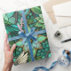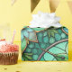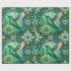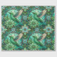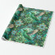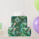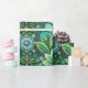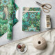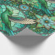 "Intricate green and teal stained glass-style pattern featuring hummingbirds and flowers on a rolled and flat surface. The design conveys a serene and elegant tone."