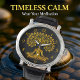 Bilden visar en fantastisk Buddha-staty i guld, skildrar serenfunktioner och intrikata utformningar. Figur ligger i en meditativ situation, omgiven av utförliga motiv för blommigten som symboliserar fred och upplysning och skapar en lugnande atmosfär.