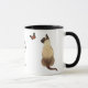 En siamesisk katt stirrar på en orange, en Monarch-fjäril medan den flippar förbi på detta söta kaffe mugg. Bilden trycks på två sidor, med den svarta texten i mitten som säger "Låt Life INTRIGUE dig". Ditt namn är skript vid grund. All text kan anpassas så att du kan ändra den till vad du vill.