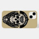En slående svart-vit illustration som visar en gotisk skalle med intrikata mönster och symboliska element, som förkroppsligar mystik och en känsla av utsmyckad detaljrikedom.