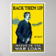 Det här Världskriget i vintage som jag poster har en äldre man som går in i fickan när artilleriet och soldaterna marscherar bakom honom. Det står: "Min plikt. "Lägg tillbaka dem, investera i krig-lånet".