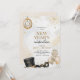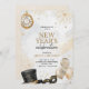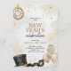 Invitation for a New Year's celebration with a clock, fireworks, top hat, mask, and balloons. Elegant gold and silver tones convey a festive atmosphere.