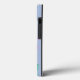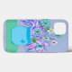 iPhone 13 fodral med en blå blomkruka i hand plockade, med löv av rosa och lila och blommor av blandad färgad. Bakgrunden är blå och bord-täcket är grönt. Du kan lägga till ditt namn i dekorn eller i det övre hörnet på högerna.