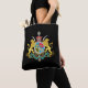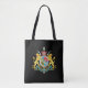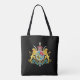 Tote Bag: Patriotic & Historical = Imperial Coat of Arms of Iran under the Pahlavi Dynasty, used from 1925 to 1979. The shield is composed of the Lion and the Sun symbol in first quarter , in the second quarter the Faravahar representing Zoroastrianism, in the third quarter the curved blade of a Imam Ali "Zulfiqar" sword representing Shia Islam, and the Simurgh in the fourth quarter. Overall in the center is a circle depicting Mount Damavand with a rising sun, the symbol of the Pahlavi dynasty. The shield is crowned by the Pahlavi crown and surrounded by the chain of the Order of Pahlavi. Two lions rampant regardant, holding scimitars supports the coat of arms on either side. Under the whole device is the motto: "Mara dad farmud va Khod Davar Ast" ("Justice He bids me do, as He will judge me" or, alternatively, "He gave me power to command, and He is the judge").