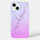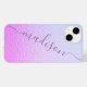 Iridescent Girly Rosa Shimmer Personlig Namn iPhone 14 Smart Phone Case har en modern rosa och Blue iridescent shimmer mönster med din personlig namn i lila-handskriven calligraphy-skripttypografi. Designad av ©Evco Studio www.zazzle.com/store/evcostudio