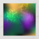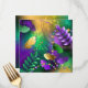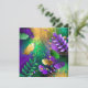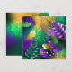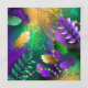 Strukturella mardigrasbakgrund med fläckar av lila, gult och grönt, dekorerade med fluffa fjädrar och glansig pärlor. Mardi gras helgdag.