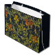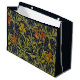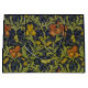 Den här designen innehåller ett tygmönster som skapats av den brittiske konstnären William Morris (1834-1896), som är associerad med konst- och hantverksrörelsen. Den skildrar blommor av blått och orange i ett elegant symmetriskt mönster. Blomman heter efter Iris, som var regnbågens grekiska gudinna och budbärare för de olympiska gudarna, som förde budskap till mänskligheten. Iris-växternas löv och stammar återges i blått och grönt. Det finns några fåglar i gulten som lever på en del av plantornas löv. Mönster var designat av William Morris 1887.