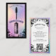 Lyft din ögonfransstudio eller ögonfranskonstnär-varumärke med vårt Iridescent Holografisk Vintage Ögonfransstudio-kort, med en handritad utsmyckad rullningsram placerad mot en falsk iriserande holografisk bakgrund för en slående, tarot-inspirerad look. Framsidan visar en vintage mascara-sticka centrerad inom rullningsdesignen, vilket ger utrymme för din studiets namn och slogan, medan baksidan visar eleganta detaljer, en iriserande holografisk ram och din kontaktinformation med en QR-kod för enkla bokningar. Den dramatiska blandningen av svart i kombination med glänsande holografiska accenter skapar en sofistikerad, mystisk estetik, perfekt för ögonfransstudior, ögonfranskonstnärer och skönhetsproffs som sö
