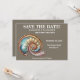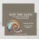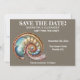Meddela om din speciella dag med förfinad kustnära elegans med hjälp av denna slående design för "save the date"-meddelanden. Ett falskt skimrande konkusskal, återgivet i lysande iriserande toner, vilar vackert mot en djup stenhård brun bakgrund - skapar en rik, glödande kontrast som känns både modern och tidlös.