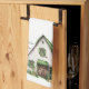 S:t Patrick's Day-kökshandduk med en vattenfärgad illustration av ett klassiskt, vitt irländskt lantbruk med grönt shudders, ett par brunnar nära ladudörren, blommor i fönsterlådor, två fjärilar i den irländska flagga skuggor, ett baby lamm som sticker ut från högerna av ladugården, en svart och vit ko som sticker ut från hemmets lämnat och en guldläggning på framsidan. Till lämnat om bilden, en irländsk välsignelse - må dina problem vara mindre, dina välsignelser vara mer och inget annat än glada komar genom dörren i ett grönt-teckensnitt.
