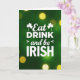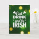 This greeting card features an emerald green background with a soft gradient that adds depth, like a cozy pub wall lit from across the room. Centered in the design, large white text reads “Eat DRINK > and be < IRISH,” with “DRINK” and “IRISH” in strong uppercase letters that stand out clearly. The words “Eat” and “and be” appear in a flowing, cursive-like style, giving the message a friendly, slightly romantic touch, like an inside joke shared over a toast 💚. Small white shamrocks sit near the top around “Eat,” acting like gentle little accents that frame the message. Across the green field, warm golden-yellow bokeh dots drift like distant string lights, adding a soft glow that feels welcoming ☘️. The white lettering stays crisp against the green and gold palette, making the layout easy to read at a glance. The “>” and “<” symbols sit on either side of “and be,” creating a simple visual rhythm in the center. The background is sprinkled with many out-of-focus golden circles, scattered unevenly from top to bottom.