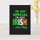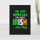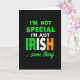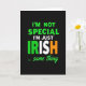 This card features a black background with a centered, multi-line message that reads, “I’M NOT SPECIAL I’M JUST IRISH … same thing,” stacked down the middle for instant impact. The lettering is mostly bright green and white, creating a strong contrast that feels like a friendly wink shared between close friends. The word “IRISH” becomes the focal point, with the “I” and “R” in green, the “S” in white, and the “H” in orange, echoing the Irish flag in a simple, striking way ☘️. The main lines sit in the upper and middle area, spaced evenly so the eye moves smoothly from top to bottom. The tone comes through visually like an inside joke—confident, a little cheeky, and warmly inclusive 💚. Near the bottom, the smaller phrase “… same thing” appears in green, slanted lettering that reads like a quick aside. All the text stays aligned along the central vertical axis, with the orange “H” in “IRISH” standing out sharply against the deep black.
