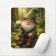 A jolly gnome in a green hat and jacket sits cheerfully on a tree stump, clutching a mug of frothy green beer amidst lush clover and dappled sunlight, radiating whimsical charm