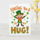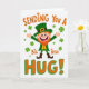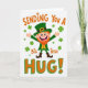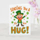 This card shows a cheerful cartoon leprechaun centered on a white background, arms stretched wide as if pulling a friend close for a big hug 💚. He wears an emerald green suit with a golden waistcoat and a green top hat topped with a shiny buckle, and his rosy cheeks and bright eyes pair with a full red beard that makes his grin feel inviting. Around him, orange lettering wraps the scene with the message “SENDING You A BIG IRISH HUG!”, with “SENDING” and “IRISH” set near the top and “HUG!” landing larger and heavier near the bottom. The dots over the i’s in “SENDING” and “IRISH” are replaced with tiny shamrocks, adding a sweet little nod to the holiday ☘️. Larger clovers—some three-leaf and a few four-leaf—float around him like confetti, giving the space a light, festive lift. The colors stay mostly green and orange, and the flat, shadowless lighting keeps everything bright and easy to read. “HUG!” is drawn with extra depth and shading so it pops forward, while the leprechaun’s open hands sit right beneath the text as if offering the embrace. Small clovers drift across the white space, framing the leprechaun’s hat, shoulders, and outstretched palms.