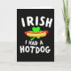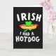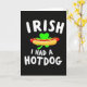 This card features a deep black background where the white phrase “IRISH I HAD A HOTDOG” sits centered in a rounded sans-serif style, grabbing your attention right away. The words are arranged in the middle so the joke reads clearly, with the illustration tucked in as part of the layout rather than off to the side. Beneath the text, a bright green shamrock ☘️ spreads out like a lucky base, and a hotdog rests over it as if it’s been set down with a fond, teasing grin. The frankfurter is a strong red, the bun is golden-brown, and the mustard runs in a neat yellow zigzag that feels like a little flourish shared between friends 💚. The contrast between the dark backdrop and the light lettering makes the colors stand out sharply without feeling busy. The shamrock’s green glow frames the snack like a small badge of St. Patrick’s Day fun, turning the pun into a cozy inside joke. The mustard line is drawn in a single wavy stripe across the top of the hotdog, bright yellow against the red and tan.