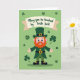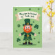 This greeting card features a friendly leprechaun centered on a pale green background, his rosy cheeks and bushy orange beard giving him a soft, welcoming look. He wears a tall dark green hat with a gold buckle, and his arms stretch outward as if he’s about to pull a friend into a quick hug 💚. Small shamrocks float around him in different sizes, adding a light, lucky feel without crowding the scene ☘️. Near the top, a cream banner curves across the card, drawing your eye upward like a ribbon in the breeze. The message “May you be touched by Irish luck” sits on the banner in flowing cursive-style lettering, set in a darker green that stands out against the cream. Simple shapes and strong outlines keep the leprechaun easy to read, with warm facial details that suggest easy friendship. The background stays pale green while the shamrocks and banner create a scattered, airy pattern around the central figure. End with a friendly line about sharing St. Patrick's Day sentiments.