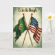 This design shows two crossed flags on shiny gold staffs, leaning toward each other like close friends sharing a quiet moment 💚. The left flag is a deep emerald green with a detailed gold emblem that resembles a Celtic harp, outlined in glowing gold lines. On the right, the American flag appears slightly aged, with softened red stripes and a muted blue canton dotted with pale stars, giving it a gentle, timeworn look. Their poles overlap neatly at the center, and the gold finials catch the light as if they’re being shown off for a special day ☘️. Above the flags, “Erin Go Bragh” sits centered near the top in a serif font, with gold lettering edged by a darker outline for contrast. Behind everything is a pale sage-green background with a lightly mottled texture, like brushed paper with a soft patina. The green banner curves outward on the left while the American flag drapes to the right, both with visible folds and shaded ripples along their edges.