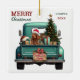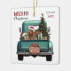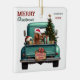 En tårblått pickup lastbil bär ett dekorerat Helgdag träd och presentat paket på denna söta julprydnad av glas. Tittar ut från skevakten är en vacker Irish Setter-hund som bär en röd och vit Jultomten-hatt. En rustik träskylt på stötfångaren säger "Julturen". Den röda och grönt stiliserade texten längst upp till lämnat står "GOD JUL", med ditt namn (eller hund) och året vid högerna. Båda sidor har samma bild.