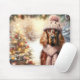 En irländsk sändare med en stickad hatt och scarf är sitta utomhus i ett snölandskap, bredvid ett dekorerat Julgran och gåvor