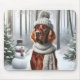 En hund med grått-trikå och scarf står i en snöskog bredvid snögubbe
