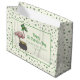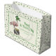 These festive Irish Shamrock Pink Flamingo St Patricks Day Ivory Large Gift Bag feature my playful pink flamingo wearing an oversized leprechaun hat beside a pot of gold coins, beautifully displayed inside a rectangular frame with your event details.