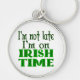 En nyckelkedja som läser att jag inte är sen, jag är på Irish Time, med keltiskt knotwork brev. Anpassa den för att lägga till ditt namn eller anpassningsbar-meddelande.