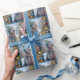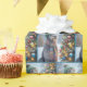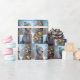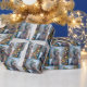 En irländsk Wolfthound som bär en stickad hatt och en färgstark sjal står bredvid ett dekorerat Julgran på en snödag