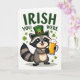This card features a cheerful cartoon raccoon on a white background, dressed in a green leprechaun hat with a gold buckle and a small clover ☘️. Its striped tail curls behind it, and its big shining eyes and wide grin suggest it’s sharing a friendly, inviting moment with whoever’s looking. The raccoon holds a large mug of golden ale topped with thick foam, angled forward like a toast between close pals 💚. Across the top, the phrase “IRISH YOU WERE” appears in dark green, all-cap letters, centered above the character. Small green shamrocks float around the raccoon, spaced out so the scene feels open and easy to take in. Strong outlines and flat color areas keep the illustration crisp, with the warm gold of the drink standing out against the greens. The hat’s buckle is a bright yellow-gold rectangle, and the shamrocks are scattered in different sizes across the white space.