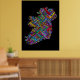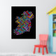 En typografisk text karta i Irland med över 590 städer och städer i Irland. Text med flera färgader i svart bakgrund.