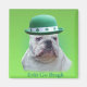 Visas är en fotografisk bild av en vit engelsk bulldog som bär en grönt baksida mot en grönt med texten "Erin Go Bragh".