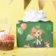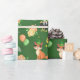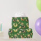 En färgrik grön presentpapper med gyllene hästsko, guldpannor, ballonger och katter