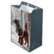 En irländsk setter hund med en mysig mössa och halsduk står i en snöig skog med snöflingor överlagd.