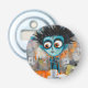 Ett färgstarkt tecken med stort, uttrycksfullt ögon och spikhåret med cirkelformade föremål börjar ut, sitta vid ett bord som är sammansatt med pappra anteckningar och kaffe koppar. Bakom figur fylls den pulserande bakgrunden med graffiti-liknande klottrar, som förenar stadskaos med karaktärets.