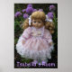 En vacker liten docka i en rosaftig llak klänning, som står i trädgården med lilac vår blommor i bakgrunden med texten Isabellas rum.Detta skulle vara en idealisk gåva till en liten flicka (eller till och med en stor flicka!)Om du vill kan den ramas in för att lägga muren eller dörren.