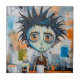 Ett färgstarkt tecken med stort, uttrycksfullt ögon och ett spräckligt hår med cirkelformade föremål. Bakom figur är bakgrunden fylld med graffiti-liknande klottrar som förenar stadskaoset med karaktärets.
