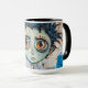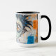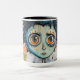 Ett färgstarkt tecken med stort, uttrycksfullt ögon och ett spräckligt hår med cirkelformade föremål. Bakom figur är bakgrunden fylld med graffiti-liknande klottrar som förenar stadskaoset med karaktärets.