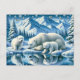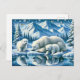 Praktfull akvarell av en vinterscen med en familj isbjörnar i ett snöigt landskap. Det finns tre isbjörnar: en vuxen och två ungar. De står på kanten av en frusen vattenmassa, med sina speglingar synliga på isen. Bakgrunden visar snötäckta tallar och höga berg under en natthimmel prydd med stjärnor och försiktigt fallande snöflingor. Denna lugna skildring framhäver naturens skönhet i den arktiska regionen.