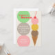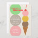En glass födelsedagsfest inbjudan med en illustration av en glasskon med tre skop (orange, choklad och jordgubbar) och ett körsbär på toppen. Lämnat sidor har tre cirklar (brun grönt och rosa) som anpassar sig efter din egen information.