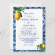 Citroner på en blå och vit botten av stil i Tuscan-Medelhavsområdet. Informationen ändras enkelt till din egen anpassningsbar-inbjudan. Monogrammet ändras lätt för initialerna. Lemon och blå färg.