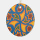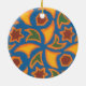 Ett runt prydnadsföremål med traditionell islamisk design i orange, gyllene gult, maron och grönt på en ljusblå bakgrund från ett skärmavtryck av Judy Adamson